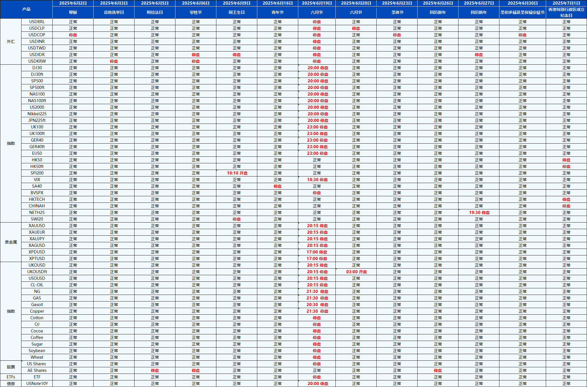 您好,受即将到来的6月份假期影响,PU Prime的交易时间将有所调整。