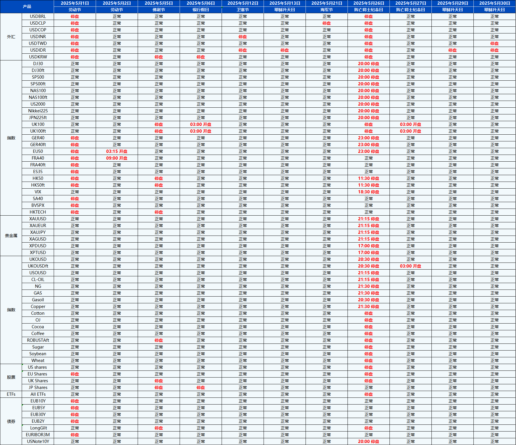 您好,受即将到来的5月份假期影响,PU Prime的交易时间将有所调整。