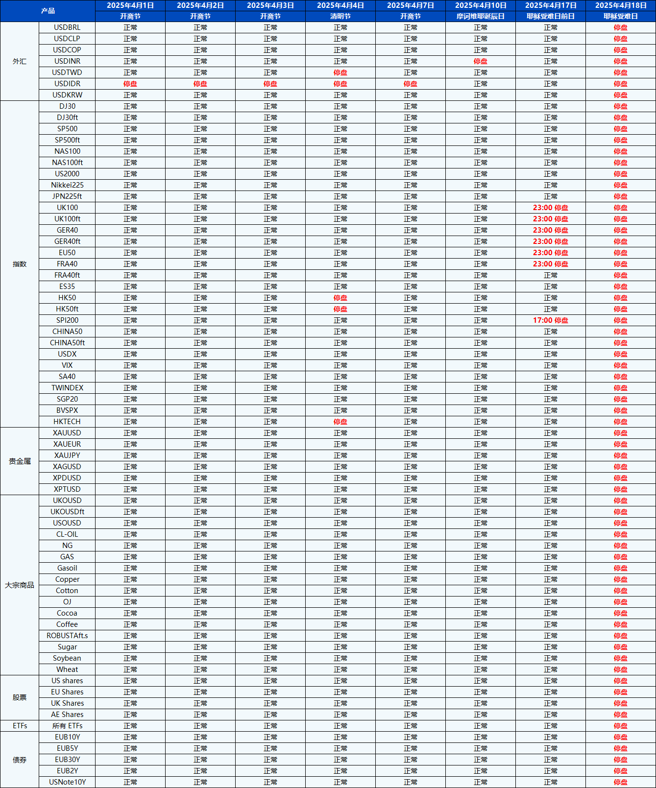 您好,受即将到来的4月上旬假期影响,PU Prime的交易时间将有所调整。