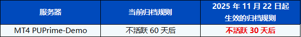 您好!PU Prime 将于 2025 年 11 月 22 日更新 MT4 模拟账户的归档规则 ,以进一步提升模拟服务器的性能并降低整体基础设施使用率。
